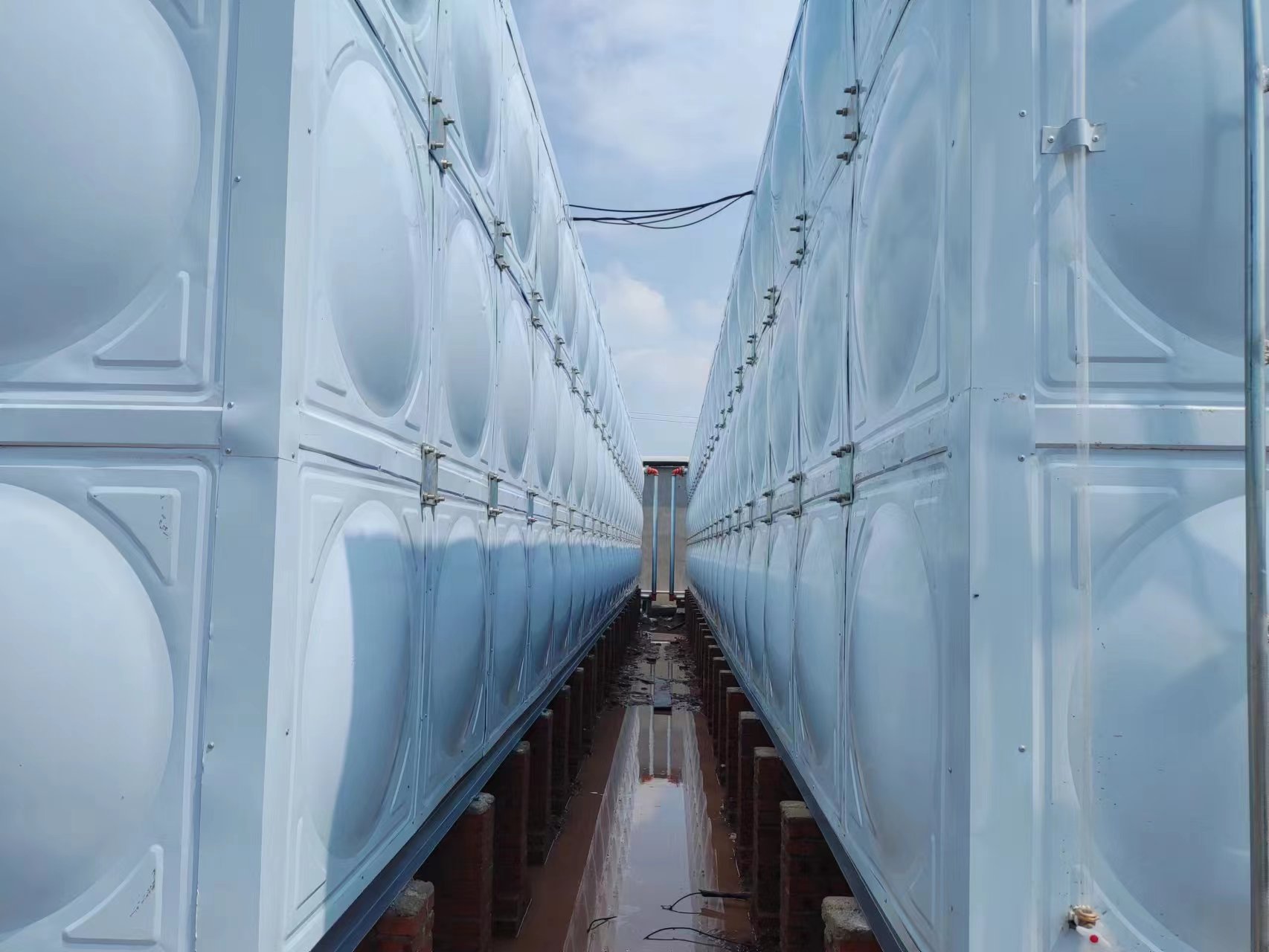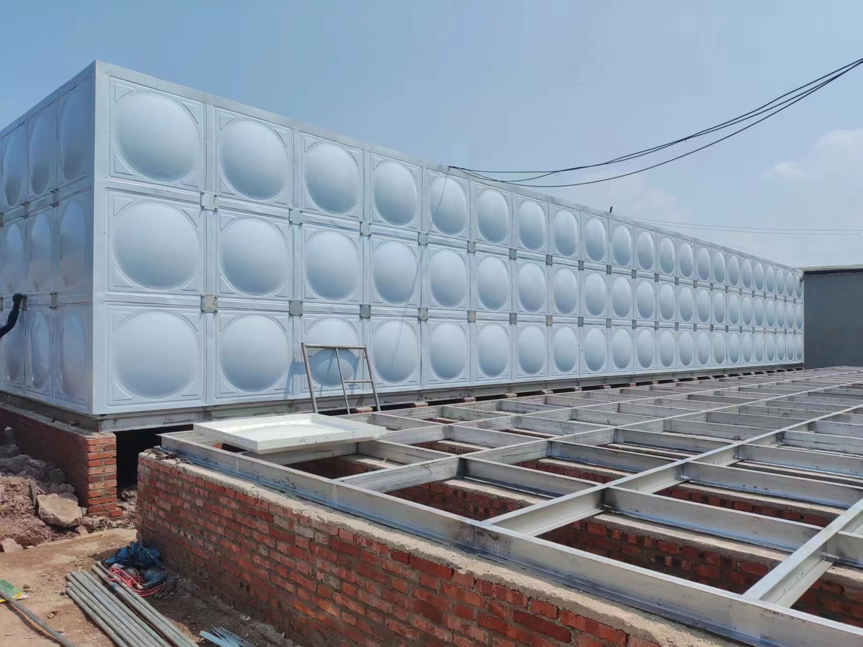 我司承接的山東省煙臺市棲霞市新好牧農場項目,玻璃鋼保溫水箱已經安裝試水完成。玻璃鋼保溫水箱是由SMC模壓板塊、密封材料、金屬結構件及配管系統現場組裝而成。可根據用戶需要靈活組裝,若原有水箱需要更換,不需要改造房屋,適應性很強。水箱整體強度高,無滲漏,無變行,保養,檢修方便。