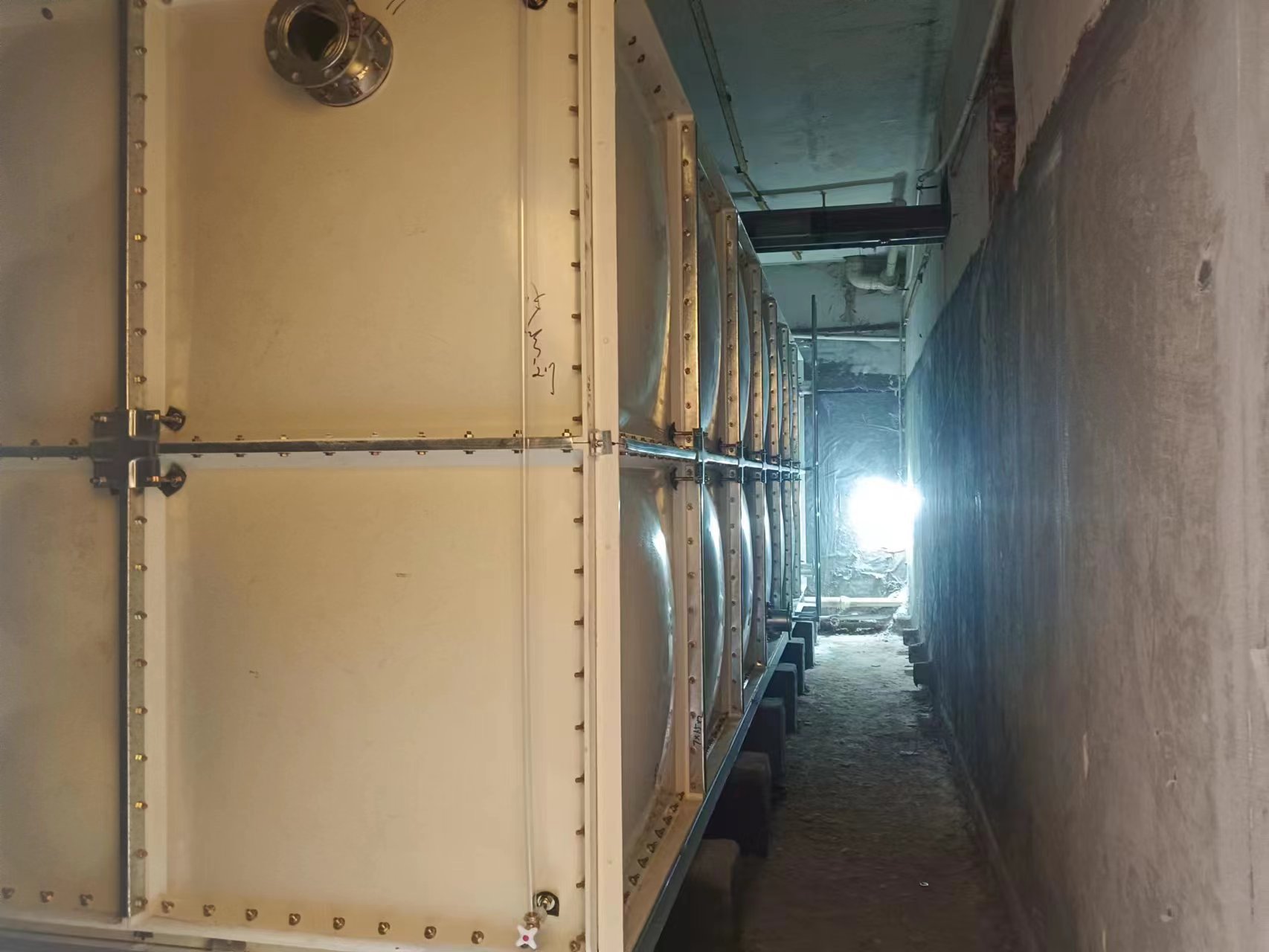 我司承接的陜西省榆林神木市億萊策大酒店兩臺SMC玻璃鋼水箱已經安裝試水完成。SMC玻璃鋼采用不飽和樹脂,了水質清潔衛生,質量輕、強度高的特性,使得同樣大小、同樣厚度的玻璃鋼板材比鋼板的重量輕了30%左右。模壓成型的方式,增加了抗震、抗沖擊的強度,克服了手糊制品強度不均勻的缺點,提高了耐壓強度和使用壽命。無滲漏,無變形,保養、檢修方便;在有限的空間內存放和安裝,很容易擴大或更換;現場組裝,定期提供,施工方便。