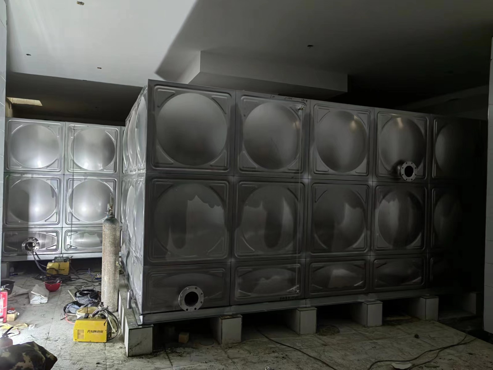 我司承接的河北省河北省廊坊市遠洋琨庭給水項目已安裝試水完畢,此水箱用作給水泵房水箱使用。不銹鋼水箱內(nèi)部結(jié)構(gòu)包括:水箱框架、焊接管、水管、閥門、填料、蓋板、隔板、排水孔(上中下)和其它附件。不銹鋼水箱一般由框架結(jié)構(gòu)和焊接管兩部分組成,其中框架結(jié)構(gòu)包括:箱體及周圍的密封墊,箱體內(nèi)部的隔板及隔板固定螺絲,支架及支架固定螺絲,進出水管,出水閥門等。